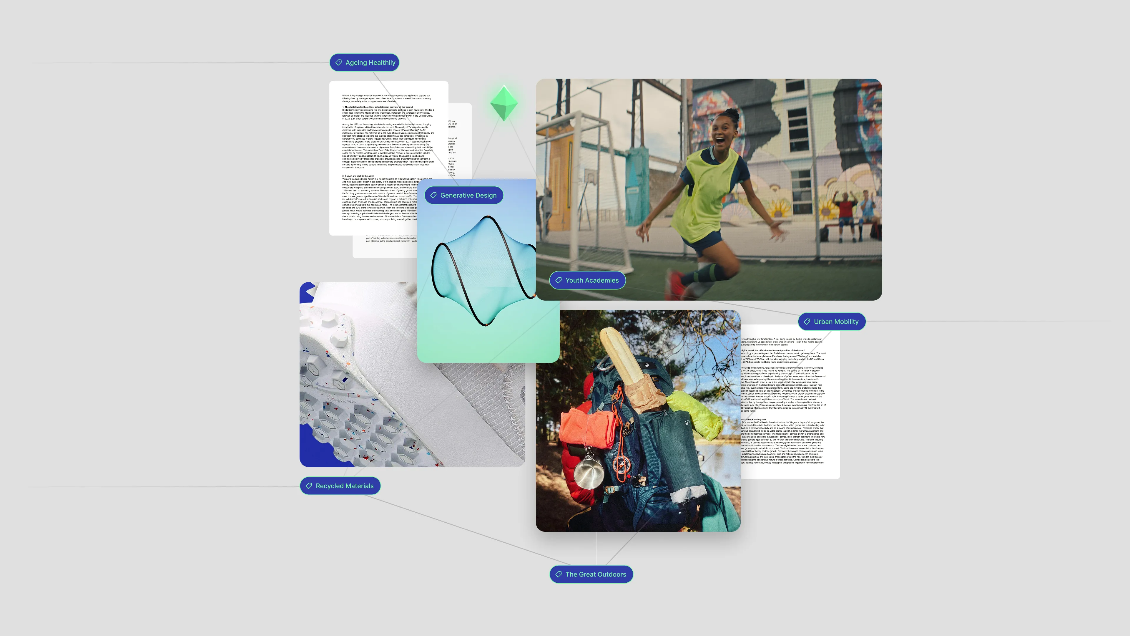 A partnership with a global sportswear company to create an AI-powered insight platform that transforms extensive research archives into a living, interactive landscape of opportunity.